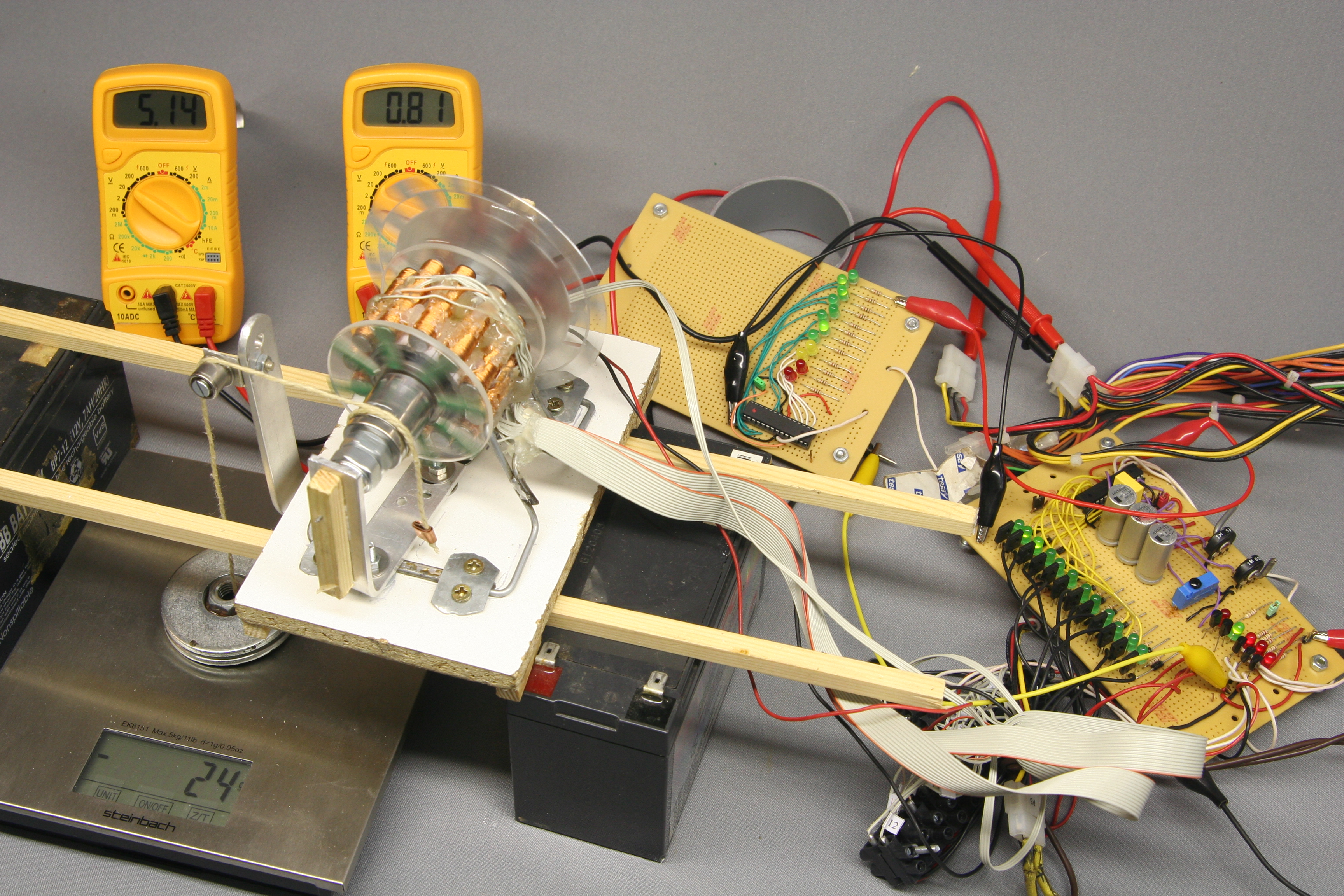 Neuigkeiten Das Projekt Technik RoboSpatium Unterstützung Stichwortverzeichnis Download Reaktionen Spiele Gadgets Kontakt Konstruktionsmerkmale des ModellmotorsDas Video zum ElektromotorBauartAnhand eines elektronisch kommutierten Motors einfachster Bauart soll die Funktionsweise von Elektromotoren ein wenig vertieft werden. Der Rotor ist mit Permanentmagneten bestückt und der Stator besteht aus Elektrospulen.Ein wesentliches Merkmal ist die Anordnung der Permanentmagnete des Rotors auf einer Scheibe, wodurch die Statorspulen gerade (Rundstäbe) ausgeführt und somit einfach herzustellen sind. EckdatenDer Modellmotor ist mit minimalem Werkzeugaufwand hergestellt worden. Benötigt werden lediglich eine Säge, eine Bohrmaschine und Kleber. Die verwendeten Materialien sind: